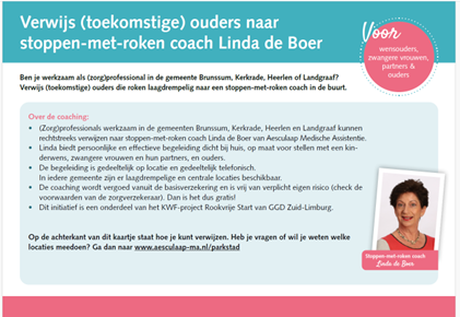 Ben je werkzaam als (zorg)professional in de gemeente Brunssum, Kerkrade, Heerlen of Landgraaf? Verwijs (toekomstige) ouders die roken laagdrempelig naar een stoppen-met-roken coach in de buurt.